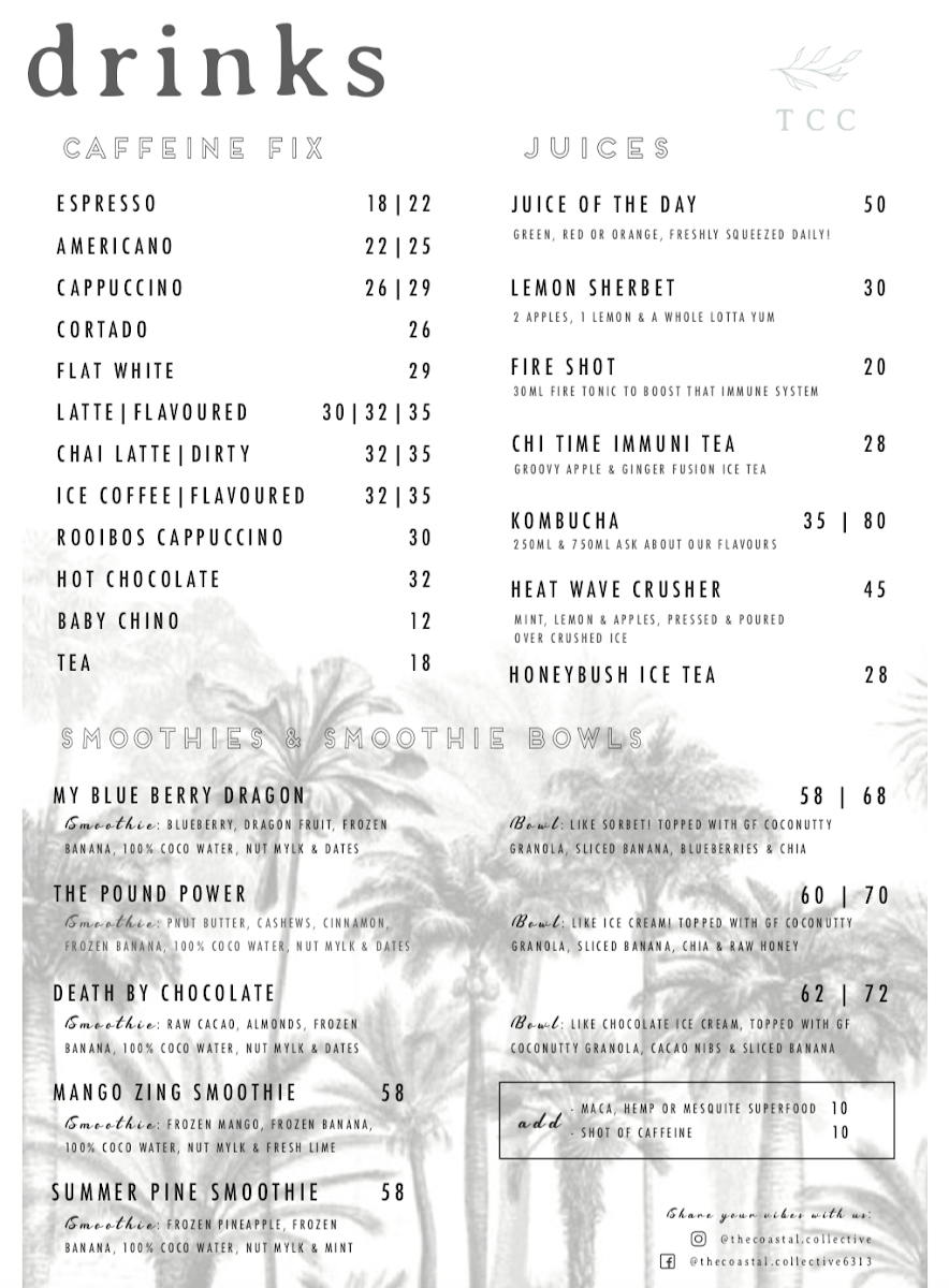 The Coastal Collective offers a menu that feels effortlessly casual yet thoughtfully crafted, perfect for those looking to enjoy simple, wholesome meals in a relaxed seaside setting. With a focus on fresh, locally inspired ingredients, the menu ranges from comforting breakfast bowls and vibrant harvest salads to classic seafood plates like line fish and chips.